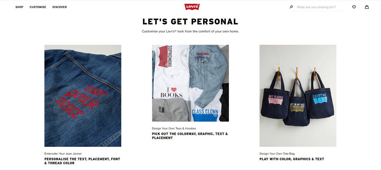 Companies like Kenzo, Nike, and Adidas are using high-end printing techniques to offer online customization, expanding their services from shoes to apparel. Levi’s is also doing the same, as the brand’s Tailor Shop enables customers to design their hoodies and t-shirts.