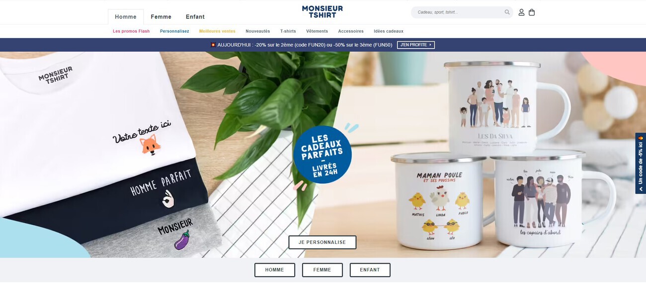 Monsieur Tshirt is another brand that based its concept on personalization through printing. The e-commerce platform invites consumers to customize everything from t-shirts to mugs, adding images, drawings, letters, names, numbers, etc.