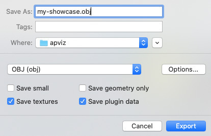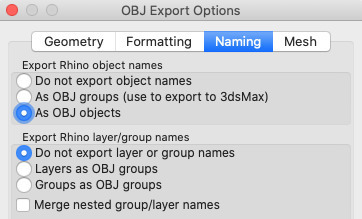 In order to use your Rhino layer names as Apviz brick keys, setup the OBJ export options like this: