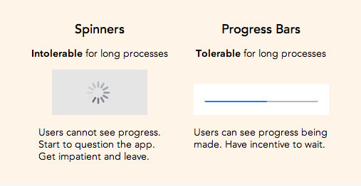 Spinners don’t tell users how long the process will take to load. If you use it for long load times, they’ll end up wondering if something went wrong with the website. The lack of feedback creates uncertainty, which discourages the user from waiting and may exit the page.
