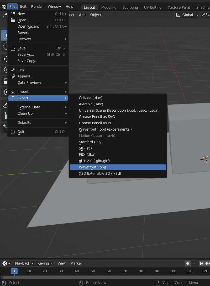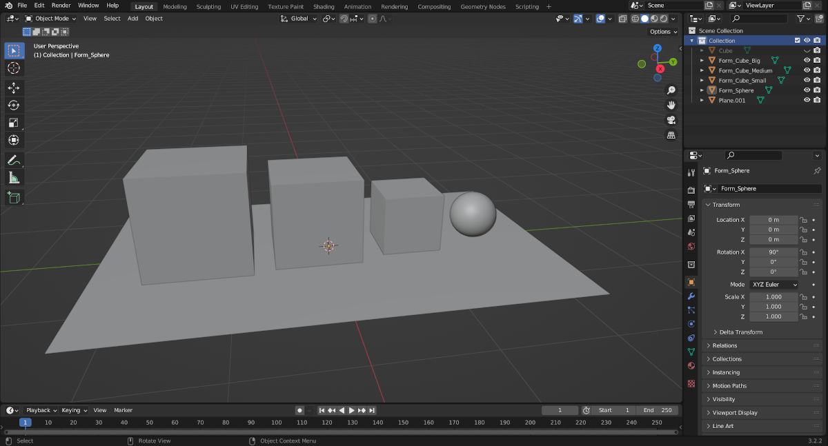 As an example, in Blender, create 3 cubes of different sizes as well as a sphere and a plane. Make sure UV projection is defined for all objects.
